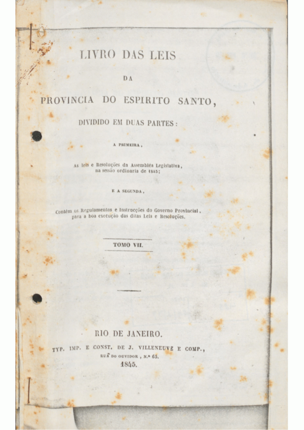 Livro das leis da Província do Espírito Santo, dividido em duas partes: a primeira, as leis e resoluções da Assembleia Legislativa, na sessão ordinária de 1845; e a segunda, contém os regulamentos e instruções do Governo Provincial, para a boa execução das ditas leis e resoluções. TOMO VII