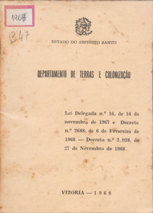 Departamento de terras e colonização: Lei delegada nº. 16, de 16 de novembro de 1967 e Decreto nº. 2688, de 6 de fevereiro de 1968 - Decreto nº. 2938, de 27 de novembro de 1968