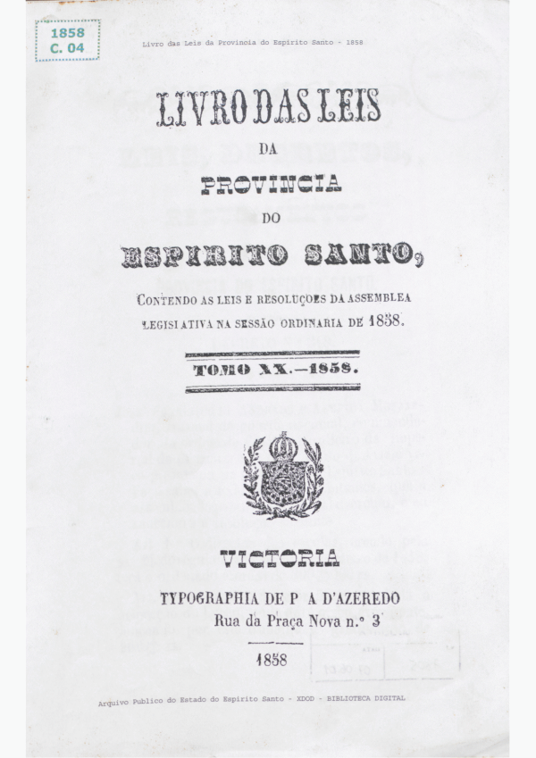Livro das leis da Província do Espírito Santo, contendo as leis e resoluções da Assembleia Legislativa na sessão ordinária de 1858. TOMO XX