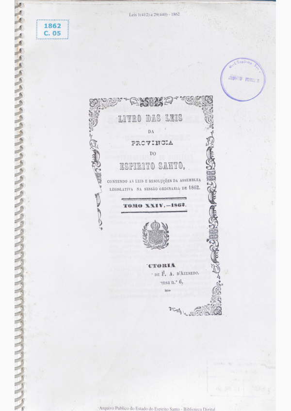 Livro das leis da Província do Espírito Santo, contendo as leis e resoluções da Assembleia Legislativa na sessão ordinária de 1862. TOMO XXIV