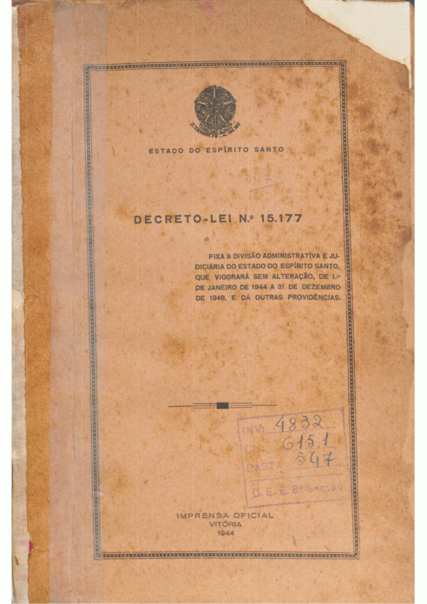 Decreto-Lei nº. 15177: fixa a divisão administrativa e judiciária do Estado do Espírito Santo, que vigorará sem alteração, de 1º de janeiro de 1944 a 31 de dezembro de 1948, e dá outras providências