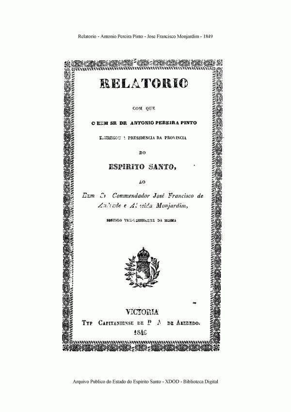 Relatório com que o Exm. Sr. Dr. Antonio Pereira Pinto entregou a presidência da Província do Espírito Santo, ao Exm. Sr. Comendador José Francisco de Andrade e Almeida Monjardim, segundo vice-presidente da mesma