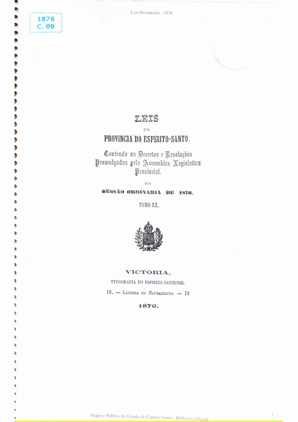 Leis da Província do Espírito Santo contendo os decretos e resoluções promulgados pela Assembleia Legislativa Provincial na sessão ordinária de 1876. TOMO XX