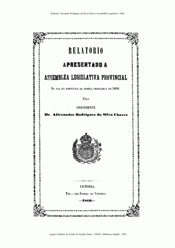 Relatório apresentado a Assembleia Legislativa Provincial no dia da abertura da sessão ordinaria de 1866 pelo presidente Dr. Allexandre Rodrigues da Silva Chaves