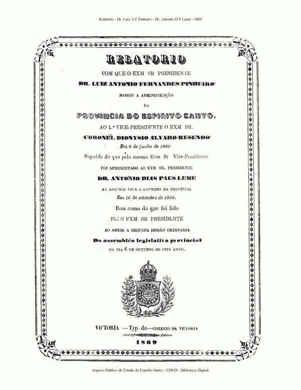 Espírito Santo, . Relatório com que o Exm. Sr. Presidente Dr. Luiz Antonio Fernandes Pinheiro passou a administração da Província do Espírito Santo ao 1º vice-presidente Dionysio Alvaro Resendo em 8 de junho de 1869. Seguido do que pelo mesmo Exm. Sr. Vice-presidente foi apresentado ao Exm. Sr. Presidente Dr. Antonio Dias Paes Leme ao assumir o governo da Província em 16 de setembro de 1869. Bem como do que foi lido pelo Exm. Sr. Presidente ao abrir a segunda sessão ordinaria da Assembleia Legislativa Provincial no dia 6 de outubro de dito ano. Vitória: Typ. do Correio da Victoria. 1869.