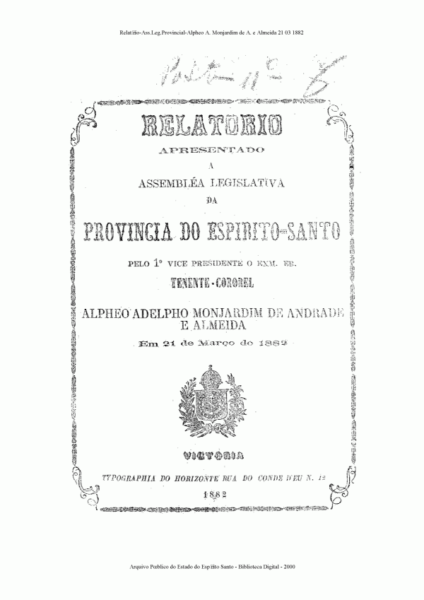 Relatório apresentado a Assembleia Legislativa da Província do Espírito Santo pelo 1º vice presidente o Exm. Sr. Tenente-coronel Alpheo Adelpho Monjardim de Andrade e Almeida em 21 de março de 1882