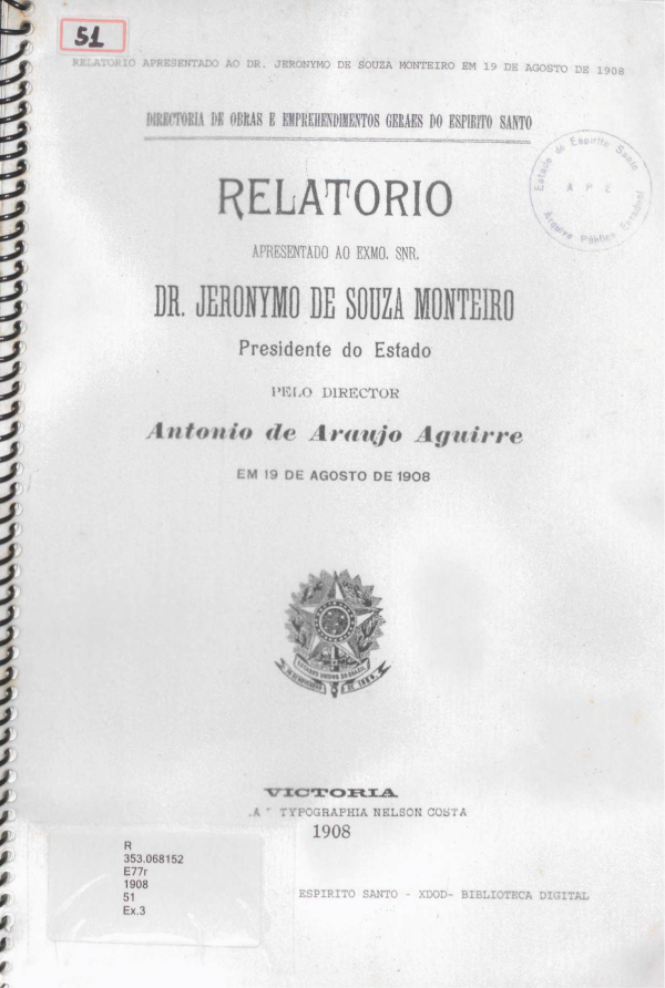 Relatório apresentado ao Exmo. Snr. Dr. Jeronymo de Souza Monteiro Presidente do Estado pelo Diretor Antonio de Araujo Aguirre em 19 de agosto de 1908.