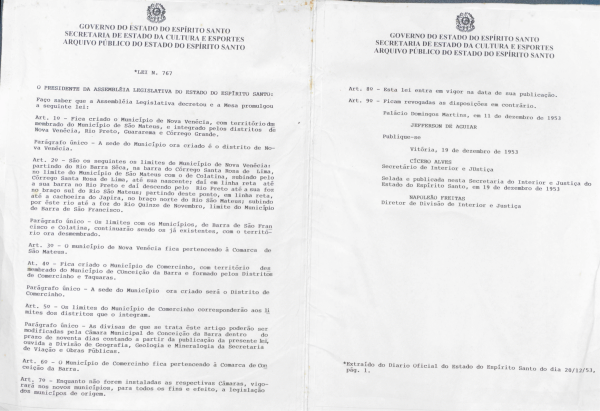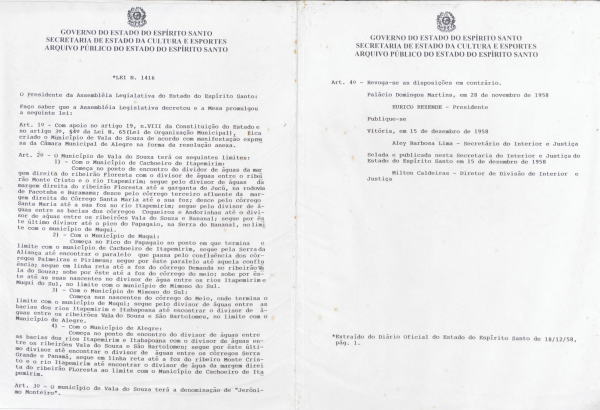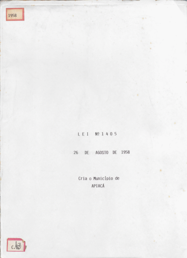 Lei nº 1405, 26 de agosto de 1958 cria o município de Apiacá