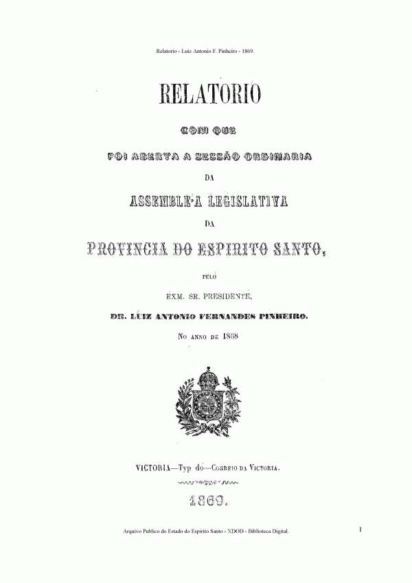 Relatório com que o Exm. Sr. Presidente Dr. Luiz Antonio Fernandes Pinheiro passou a administração da Província do Espírito Santo ao 1º vice-presidente Dionysio Alvaro Resendo em 8 de junho de 1869. Seguido do que pelo mesmo Exm. Sr. Vice-presidente foi apresentado ao Exm. Sr. Presidente Dr. Antonio Dias Paes Leme ao assumir o governo da Província em 16 de setembro de 1869. Bem como do que foi lido pelo Exm. Sr. Presidente ao abrir a segunda sessão ordinaria da Assembleia Legislativa Provincial no dia 6 de outubro de dito ano