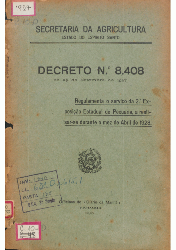 Decreto nº. 8408 de 29 de setembro de 1927: regulamenta o serviço da 2ª Exposição Estadual de Pecuária, a realizar-se durante o mês de Abril