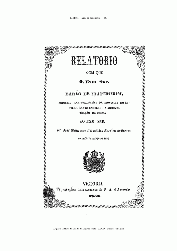 Relatório com que o Exm. Sr. Barão de Itapemirim, primeiro vice-presidente da Província do Espírito Santo entregou a administração da mesma ao Exm. Snr. Dr. José Mauricio Fernandes Pereira de Barros no dia 8 de março de 1856