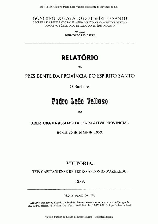 Relatório do presidente da Província do Espírito Santo o Bacharel Pedro Leão Velloso na abertura da Assembleia Legislativa Provincial no dia 25 de maio de 1859