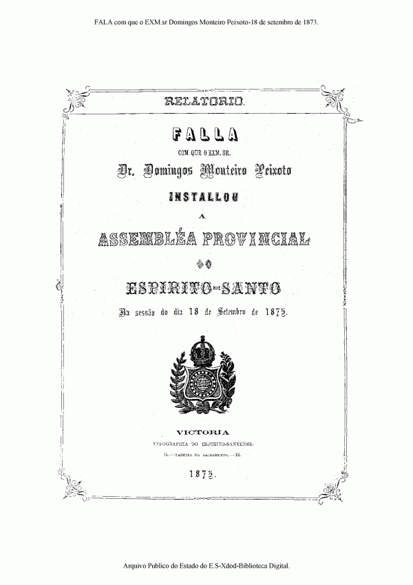 Relatório fala com que o Exm. Sr. Dr. Domingos Monteiro Peixoto instalou a Assembleia Provincial. Espírito Santo na sessão do dia 18 de setembro de 1875