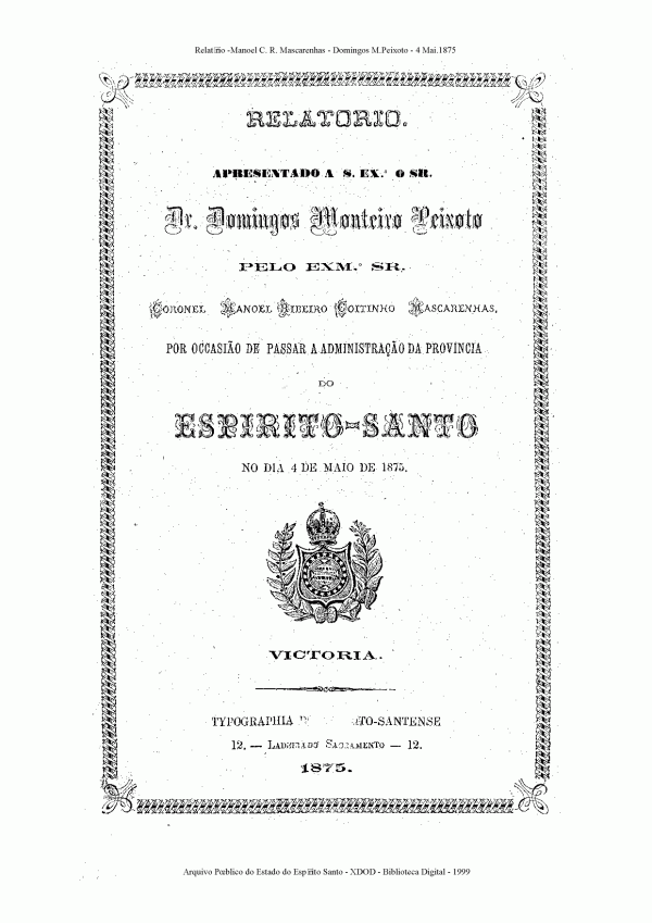 Relatório apresentado a S. Ex. o Sr. Dr. Domingos Monteiro Peixoto pelo Exm. Sr. Coronel Manoel Ribeiro Coitinho Mascarenhas , por ocasião de passar a administração da Província do Espírito Santo no dia 4 de maio de 1875