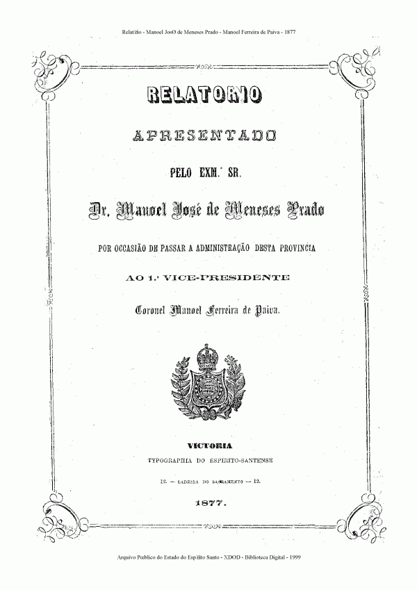 Relatório apresentado a S. Ex. o Sr. Dr. Manoel José de Menezes Prado pelo Exm. Sr. Coronel Manoel Ribeiro Coitinho Mascarenhas por ocasião de passar a administração da Província do Espírito Santo no dia 3 de janeiro de 1876