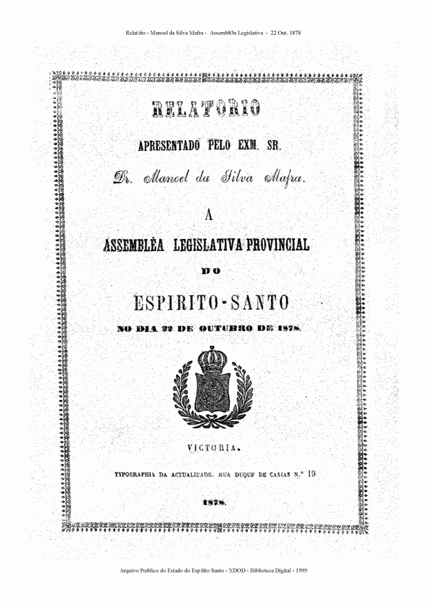 Relatório apresentado pelo Exm. Sr. Dr. Manoel da Silva Madra a Assembleia Legislativa Provincial do Espirito-Santo no dia 22 de outubro de 1878