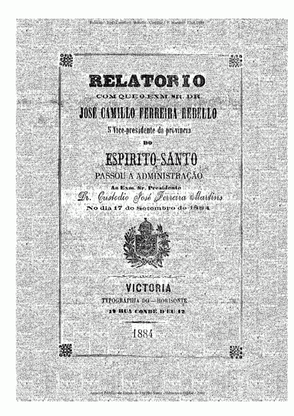 Relatório com que o Exm. Sr. Dr. José Camillo Ferreira Rebello 5º vice-presidente da Província do Espírito Santo passou a administração ao Exm. Sr. Presidente Dr. Custodio José Ferreira Martins no dia 17 de setembro de 1884