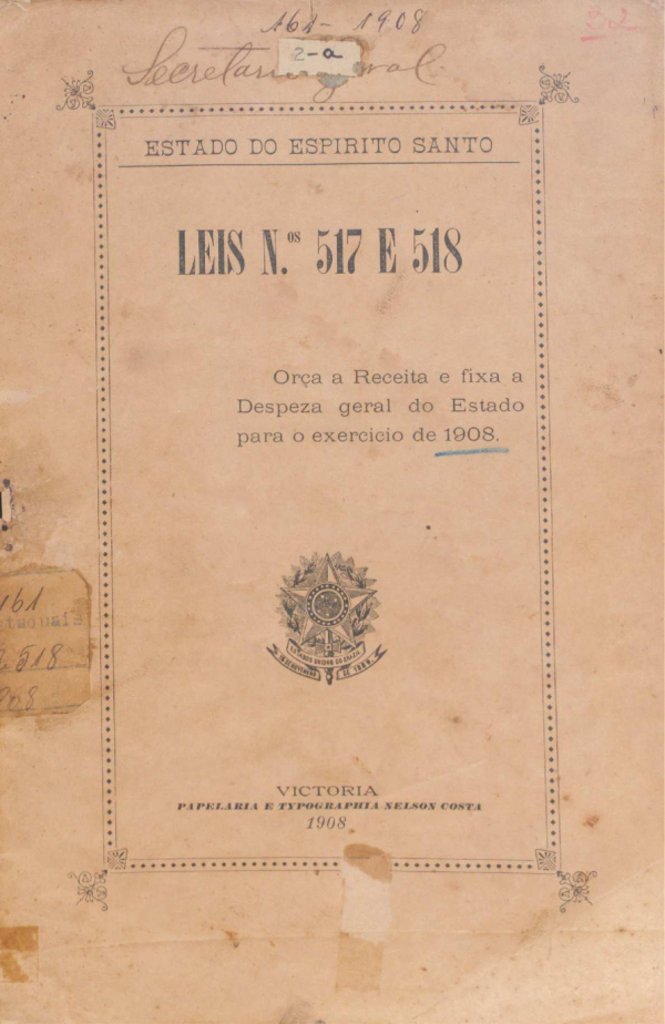 Leis nº. 517 e 518 orça a receita e fixa a despeza geral do Estado para o exercício de 1908