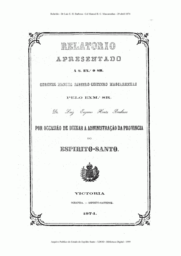 Relatório apresentado a S. Ex. O Sr. Coronel Manoel Ribeiro Coitinho Mascarenhas pelo Exmo. Sr. Dr. Luiz Eugenio Horta Barbosa por ocasião de deixar a administração provincial do Espírito Santo