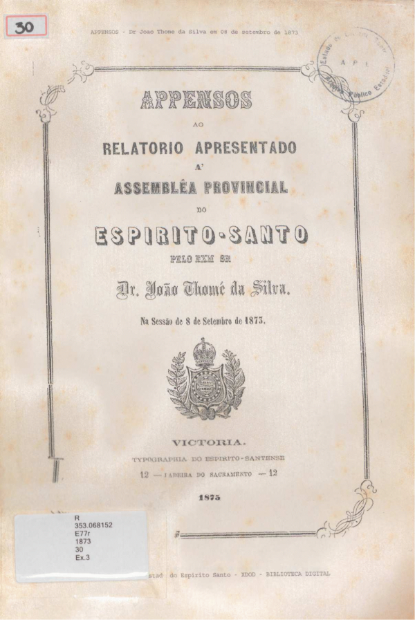 Apensos ao relatório apresentado á Assembleia Provincial do Espirito-Santo pelo Exm. Sr. Dr. João Thomé da Silva na sessão de 8 de setembro de 1873