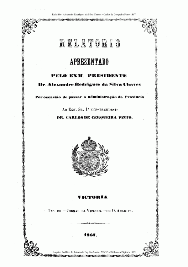 Relatório apresentado pelo Exm. Presidente Dr. Alexandre Rodrigues da Silva Chaves por ocasião de passar a administração da Província ao Exm. Sr. 1º vice-presidente Dr. Carlos de Cerqueira Pinto