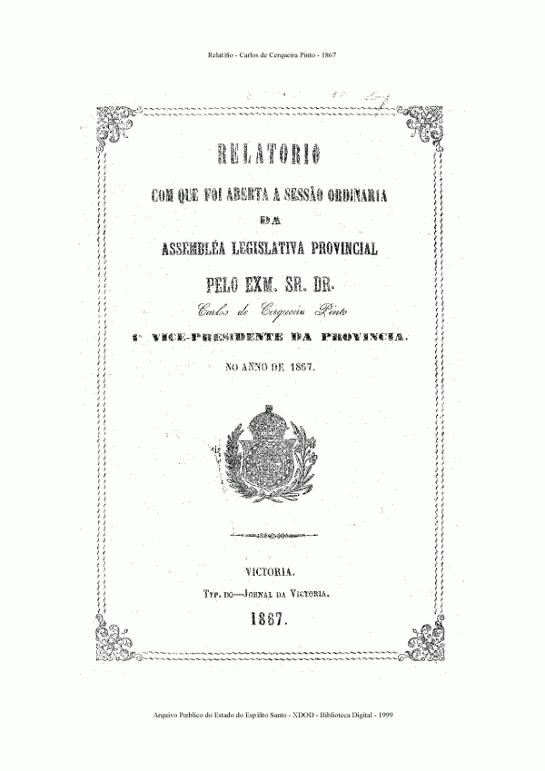 Relatório com que foi aberta a sessão ordinaria da Assembleia Legislativa Provincial pelo Exm. Sr. Dr. Carlos Cerqueira Pinto 1º vice-presidente da Província no anno de 1867