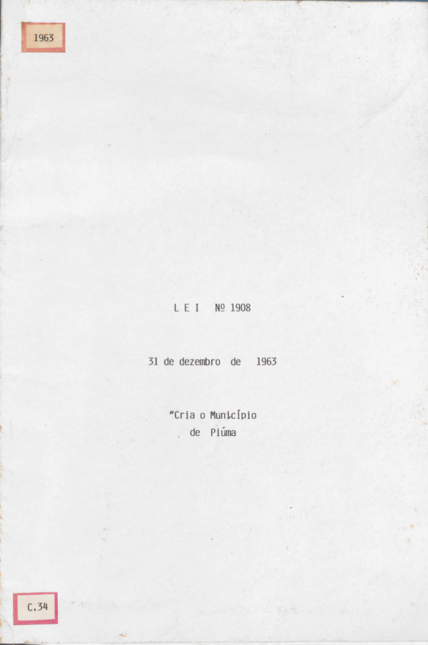 Lei nº 1908, de 31 dezembro de 1963 cria o município de Piúma