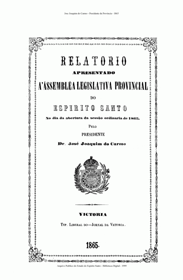 Relatório apresentado á Assembleia Legislativa Provincial do Espírito Santo no dia da abertura da sessão ordinaria de 1865 pelo presidente Dr. José Joaquim Carmo