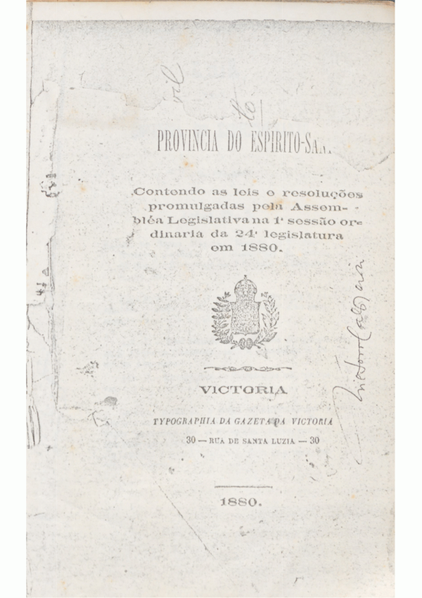 Leis da Província do Espírito Santo contendo as leis e resoluções promulgadas pela Assembleia Legislativa na 1º sessão ordinária da 24ª legislatura em 1880.