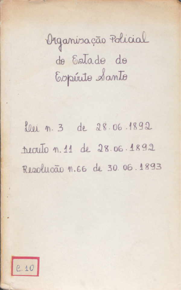 Organização policial do Estado do Espírito Santo Lei nº 3 de 28/06/1892; Decreto nº 11 de 28/06/1892; e Resolução nº 66 de 30/06/1893