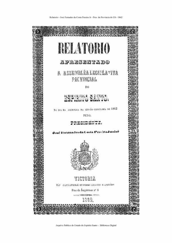 Relatório apresentado a Assembleia Legislativa Provincial no Espírito Santo no dia da abertura da sessão ordinária de 1862 pelo presidente José Fernandes da Costa Pereira Junior