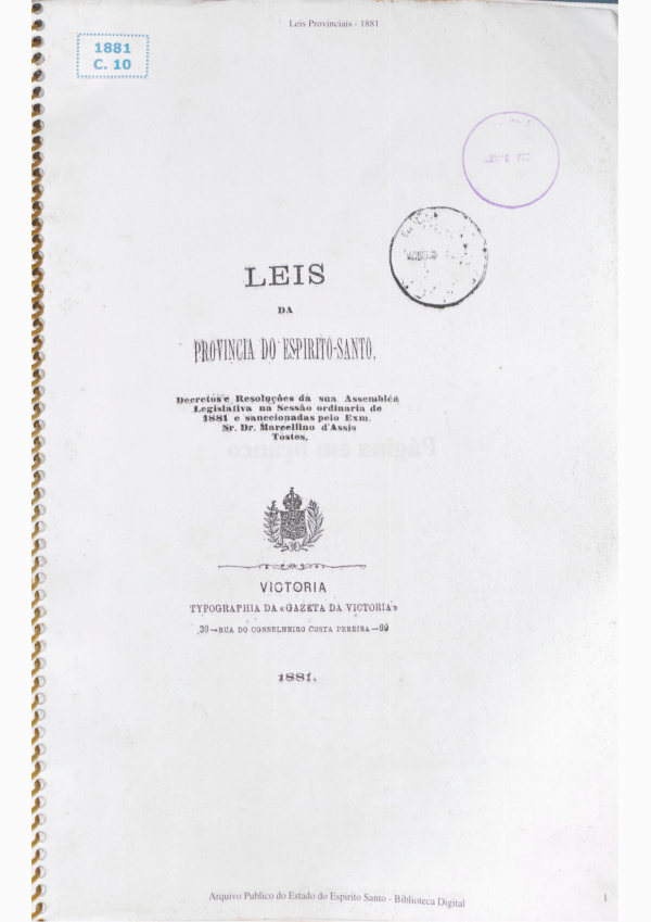 Leis da Província do Espírito Santo decretos e resoluções da sua Assembleia Legislativa na sessão ordinária de 1881 e sancionada pelo Exm. Sr. Dr. Marcellino d'Assis Tostes.